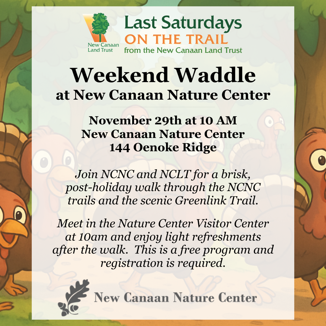 Weekend Waddle at New Canaan Nature CenterDate & Time: November 29th at 10 AMLocation: New Canaan Nature Center Join NCNC and NCLT for a brisk, post-holiday walk through the NCNC trails and the scenic Greenlink Trail. Meet in the Nature Center Visitor Center at 10 AM and enjoy light refreshments after the walk. This is […]