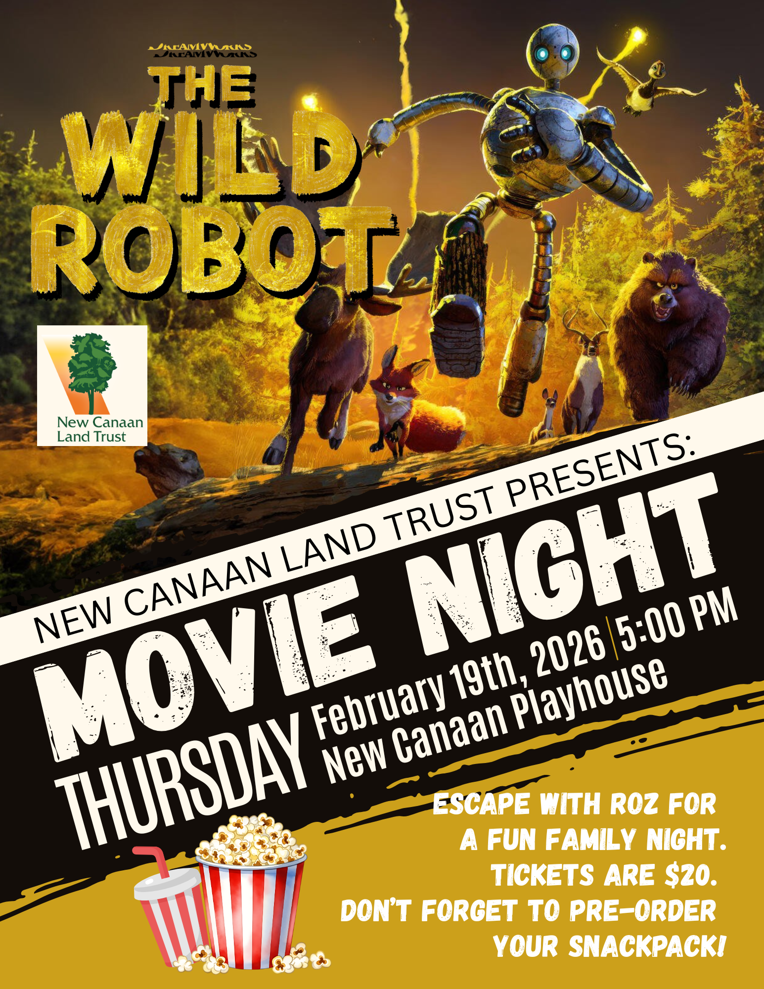 Movie Night - The Wild RobotDate & Time: February 19th at 5:00 PMLocation: New Canaan Playhouse The New Canaan Land Trust presents a screening of The Wild Robot at the New Canaan Playhouse. Tickets are $20. Don't forget to pre-order your snack pack!